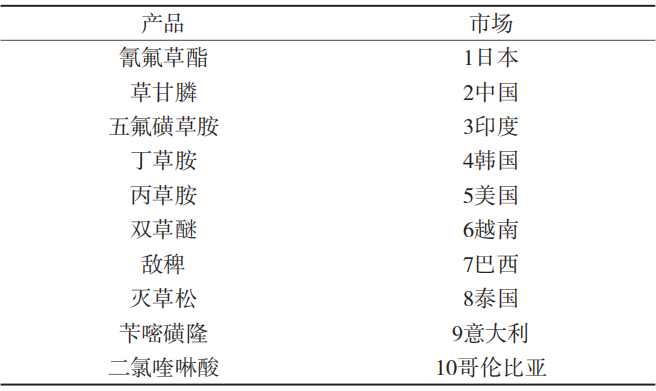全球水稻田除草劑銷售額前3名依次為氰氟草酯、草甘膦、五氟磺草胺。2018年,日本盡管種植面積減少了0.4%,但是由于日元貶值以及產(chǎn)品價格提高,日本水稻田除草劑市場增長了1.4%,達(dá)到6.05億美元。2018年中國的水稻田除草劑市場銷售額增長10.0%,達(dá)到4.86億美元。我國水稻雜草主要包括稗草、扁稈藨草、牛毛氈、雨久花等,除草劑產(chǎn)品包括滅草松、丁草胺、草銨膦和草甘膦。目前,我國水稻雜草對常用除草劑的抗性呈上升趨勢。印度的除草劑使用量相對較低,2018年水稻田除草劑市場增長了10.4%,達(dá)到2.12億美元。水稻田使用前十的除草劑品種及市場見表1。