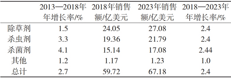 2013—2018年水稻田農(nóng)藥市場銷售額年增長率為2.7%,2018年銷售額達(dá)59.72億美元,殺菌劑、殺蟲劑、除草劑的年增長率分別為4.1%、3.3%、1.5%,銷售額分別達(dá)到15.14、19.36、24.05億美元。預(yù)測2023年水稻田農(nóng)藥銷售額為67.18億美元,2018—2023年水稻田除草劑年增長率預(yù)測為2.4%,銷售額將達(dá)到27.08億美元(見表2)。