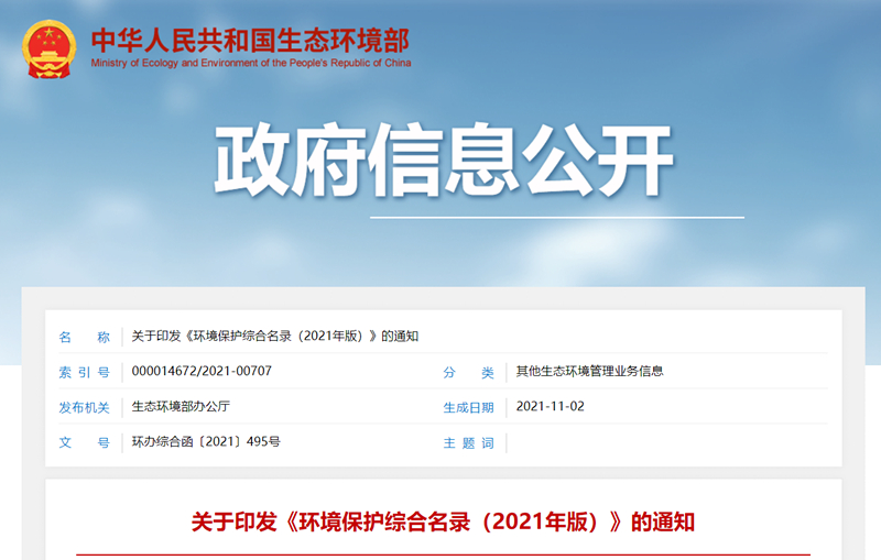 生態(tài)環(huán)境部印發(fā)《環(huán)境保護(hù)綜合名錄(2021年版)》