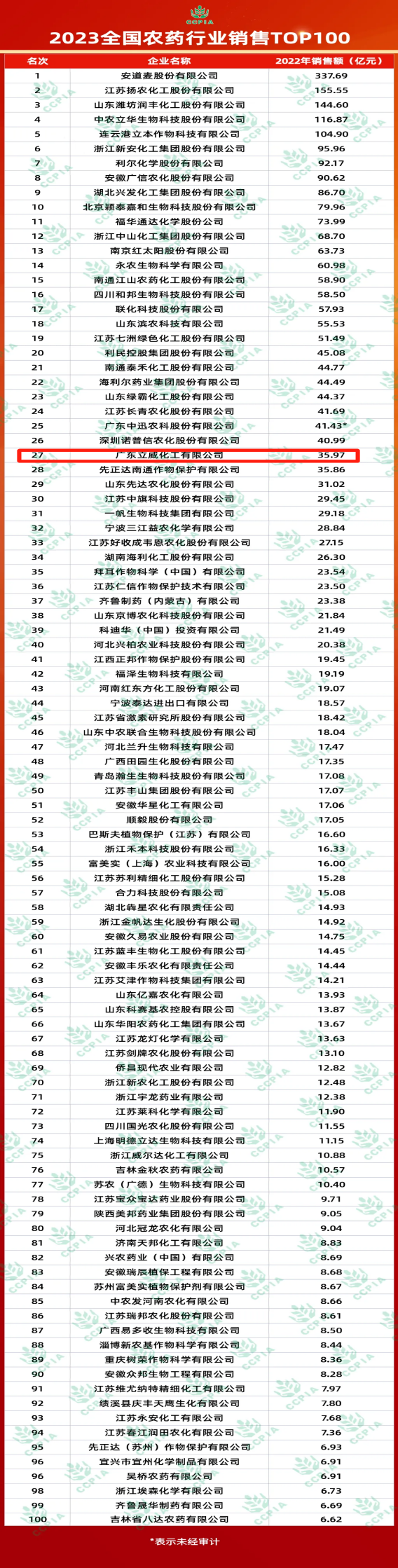 2023年5月16日,中國(guó)農(nóng)藥工業(yè)協(xié)會(huì)發(fā)布了2023全國(guó)農(nóng)藥行業(yè)銷售TOP100名單。廣東立威化工有限公司再創(chuàng)佳績(jī),以35.97億元的銷售額位居全國(guó)排名第27名。